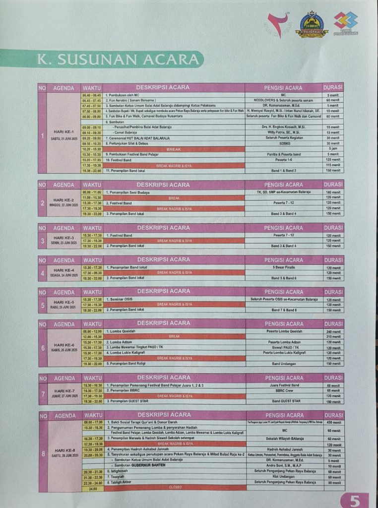 Balaraja, Kabupaten Tangerang — Dalam rangka memperingati Milad ke-2 Balai Adat Balaraja, masyarakat Balaraja dan sekitarnya akan disuguhi perayaan akbar bertajuk “Pekan Raya Balaraja”. Acara ini akan berlangsung selama sepekan penuh, mulai 22 hingga 28 Juni 2025, berlokasi di Alun-Alun Balaraja.